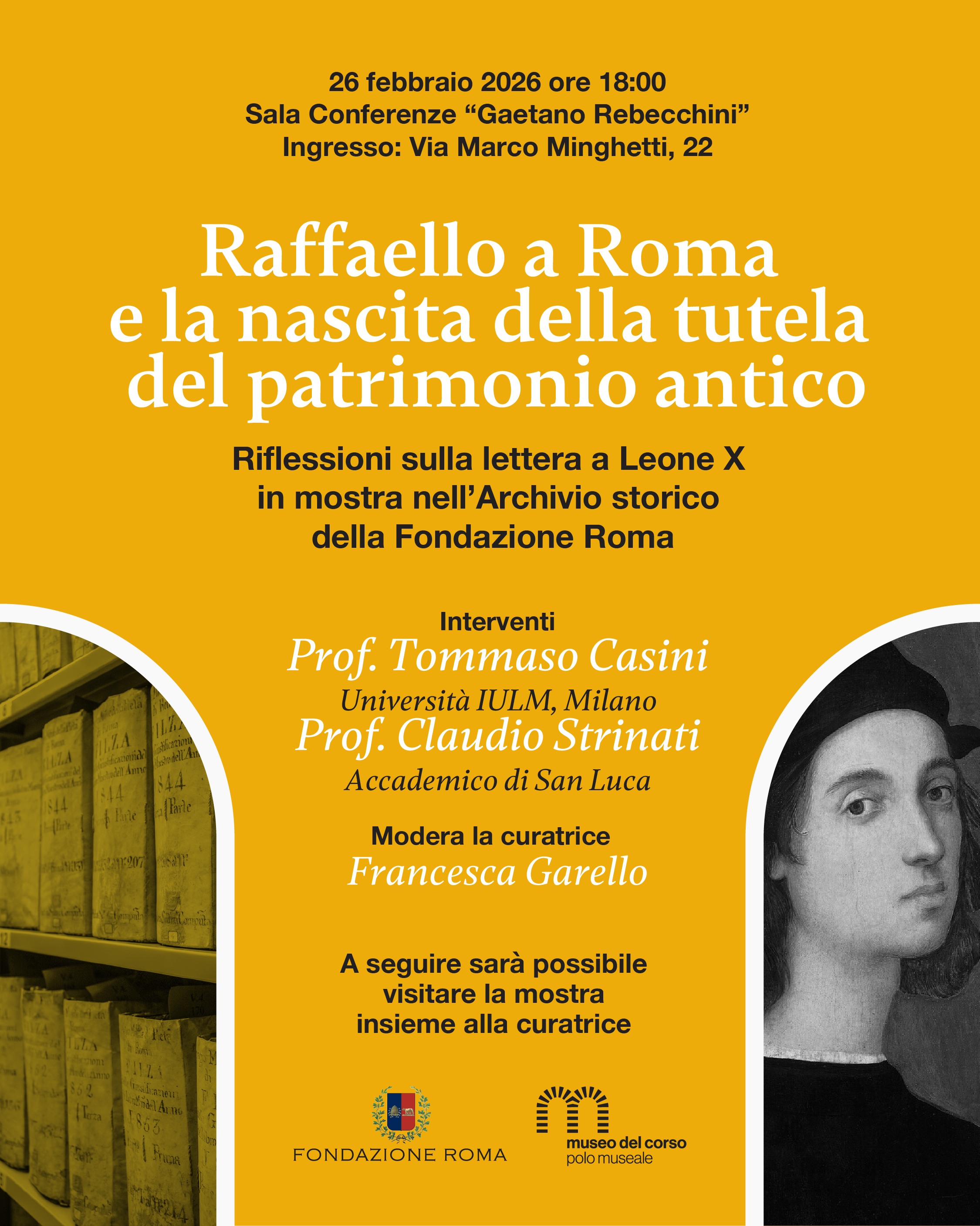 24 febbraio 2026Il 26 febbraio si svolge a palazzo Sciarra la conferenza "Raffaello a Roma e la nascita della tutela del patrimonio antico. Riflessioni sulla lettera a Leone X in mostra nell'Archivio storico della Fondazione Roma".